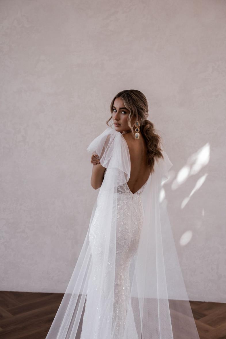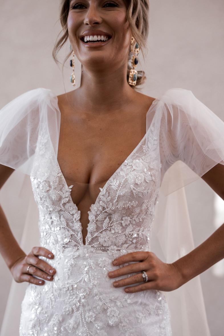 Her sheer bodice and textured lace add just the right amount of drama. Her daring, low V back elongates the body and melts effortlessly into her eye-catching, sheer train. Cameron’s detachable long tulle bows are perfect for the modern, romantic bride; clipping seamlessly onto her thin tulle straps.