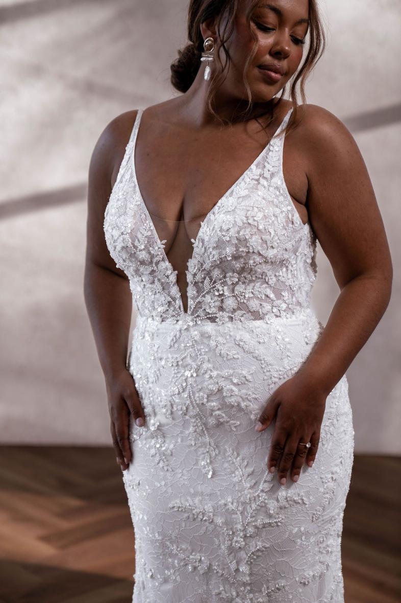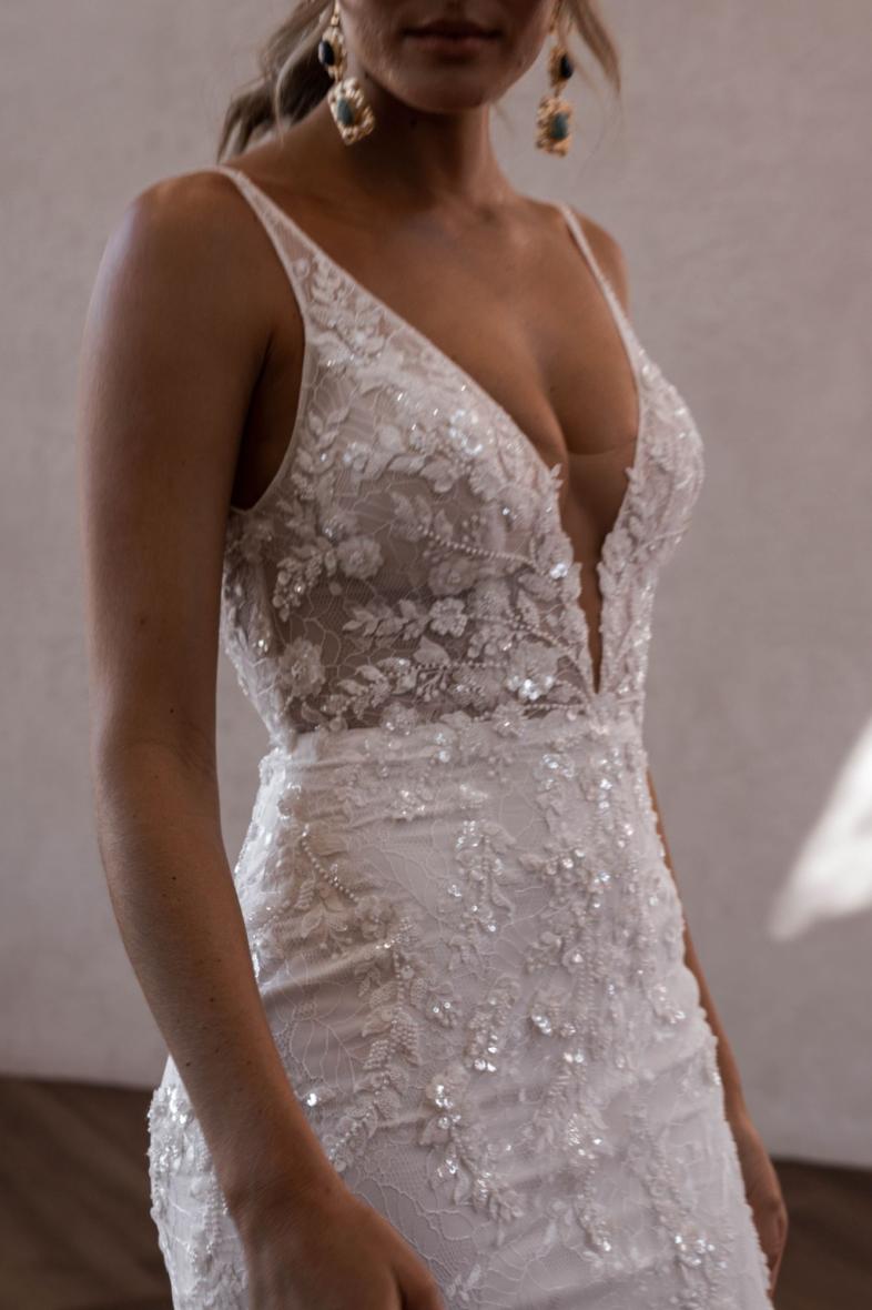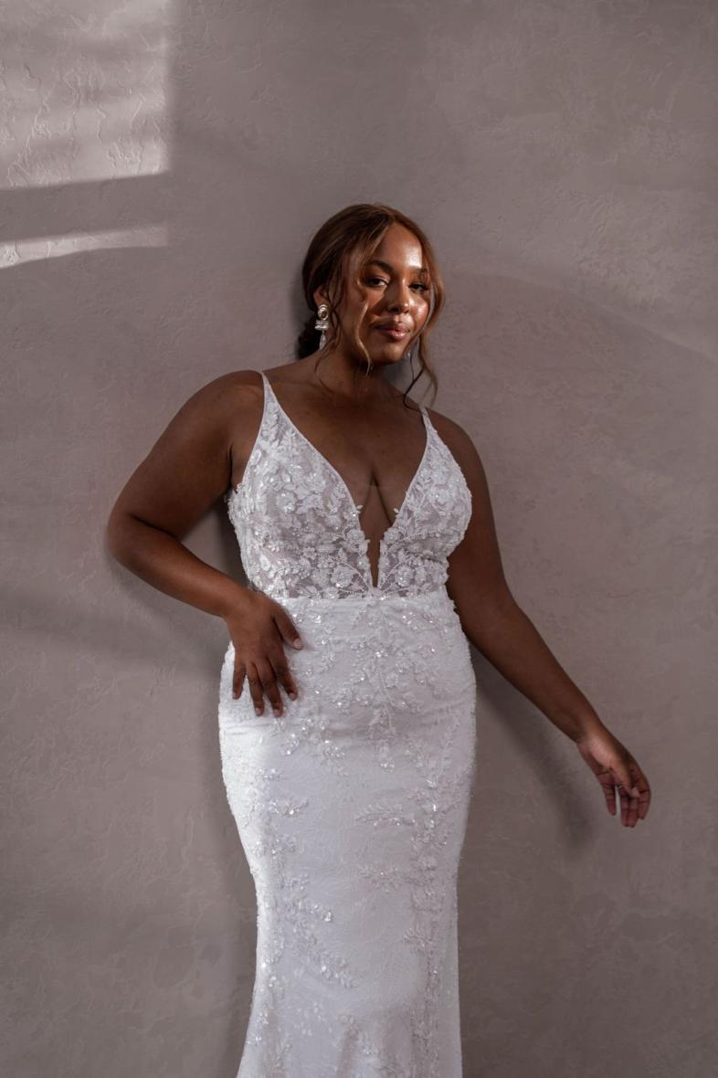 Cameron was designed with our iconic Tommy in mind. She features our classic, deep plunging neckline and our signature figure-hugging skirt that we know our MWL Girls love. Cameron is offered in our classic ivory and features hand beaded, 3D lace and an intricate Chantilly lace underlay.