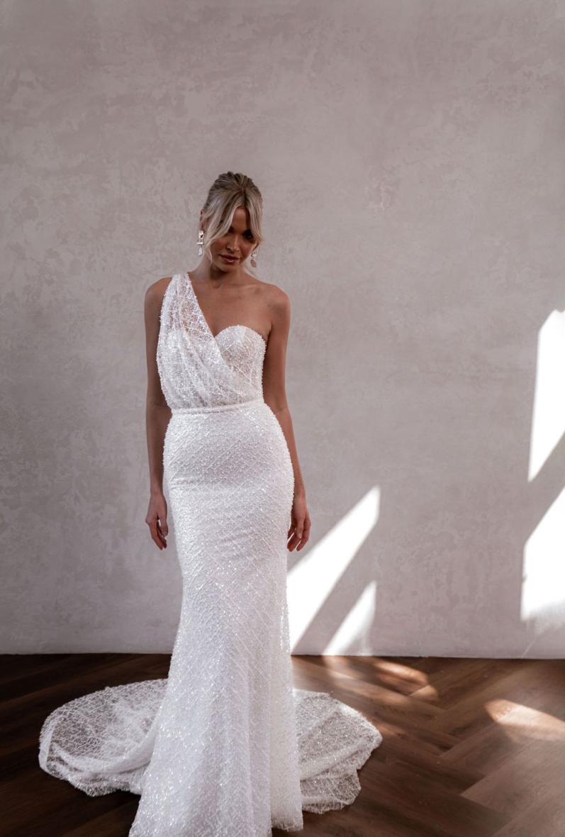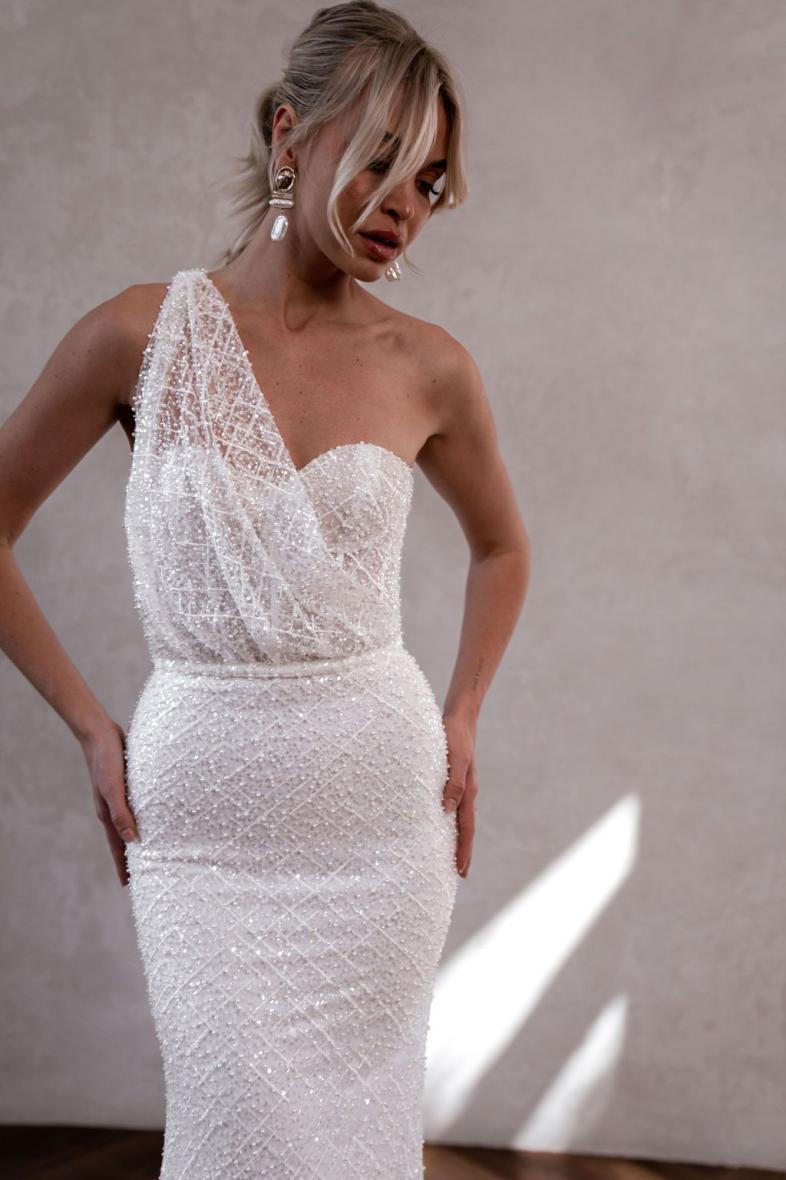 Carter combines MWL’s ever-loved and ultimately flattering corset-like bodice and figure-hugging sheath skirt with a dazzling, pearlescent bead and sequined lace.  Her asymmetrical, draped detachable top is a modern bride’s dream and provides the perfect flexibility for two stunning and unique looks on your