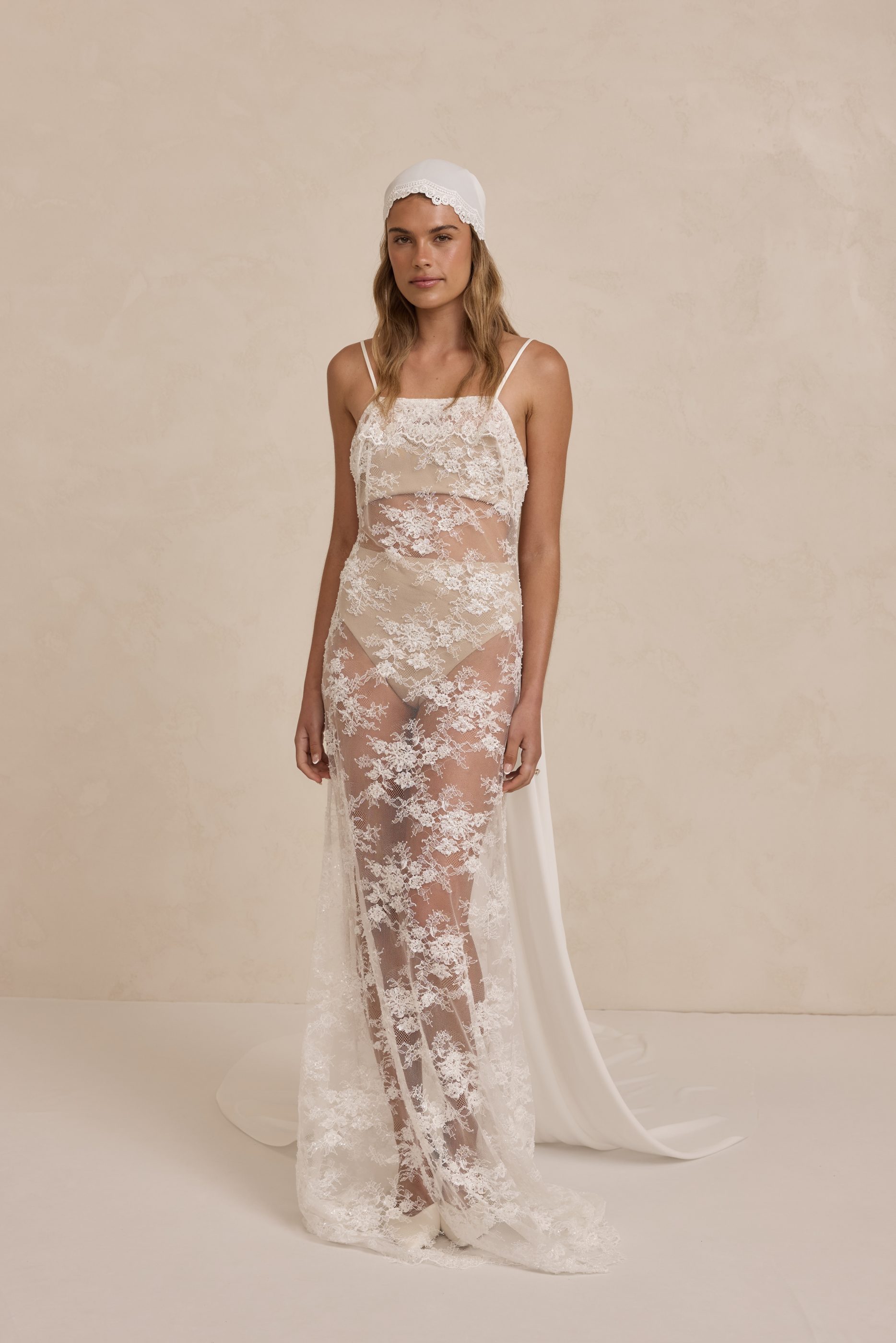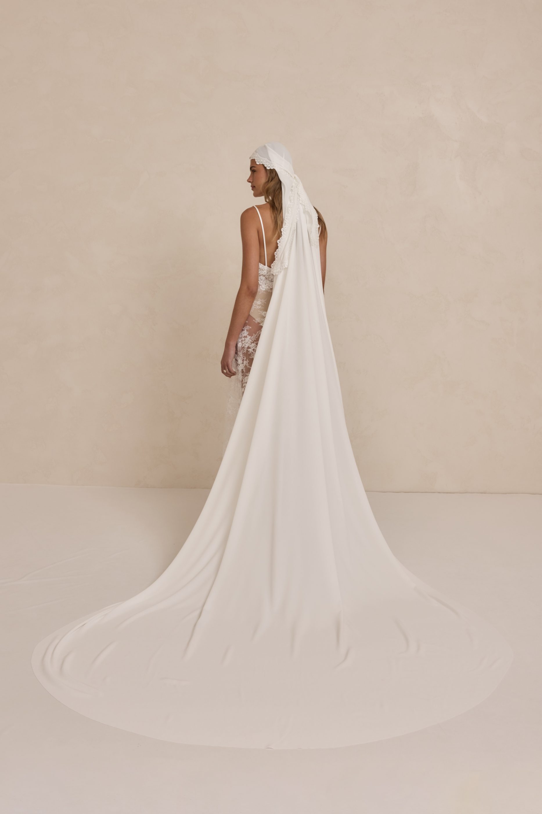 The Millie Head Scarf is crafted from luxurious thick chiffon, offering an elegant drape and timeless appeal. The front is adorned with a delicate trim, inspired by our original Frankie design, bringing a touch of vintage charm to this modern piece. Perfect for adding subtle sophistication to your bridal look.