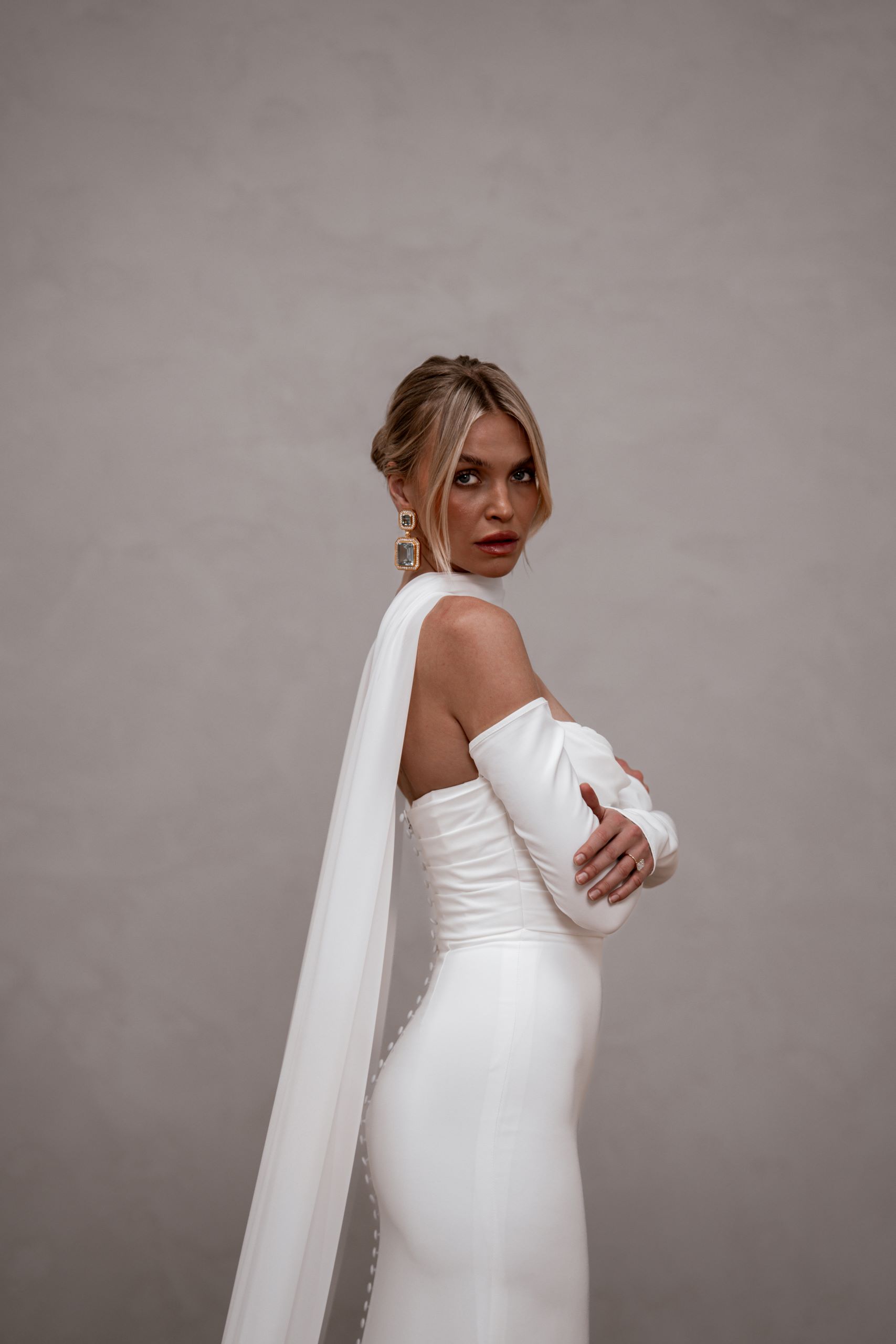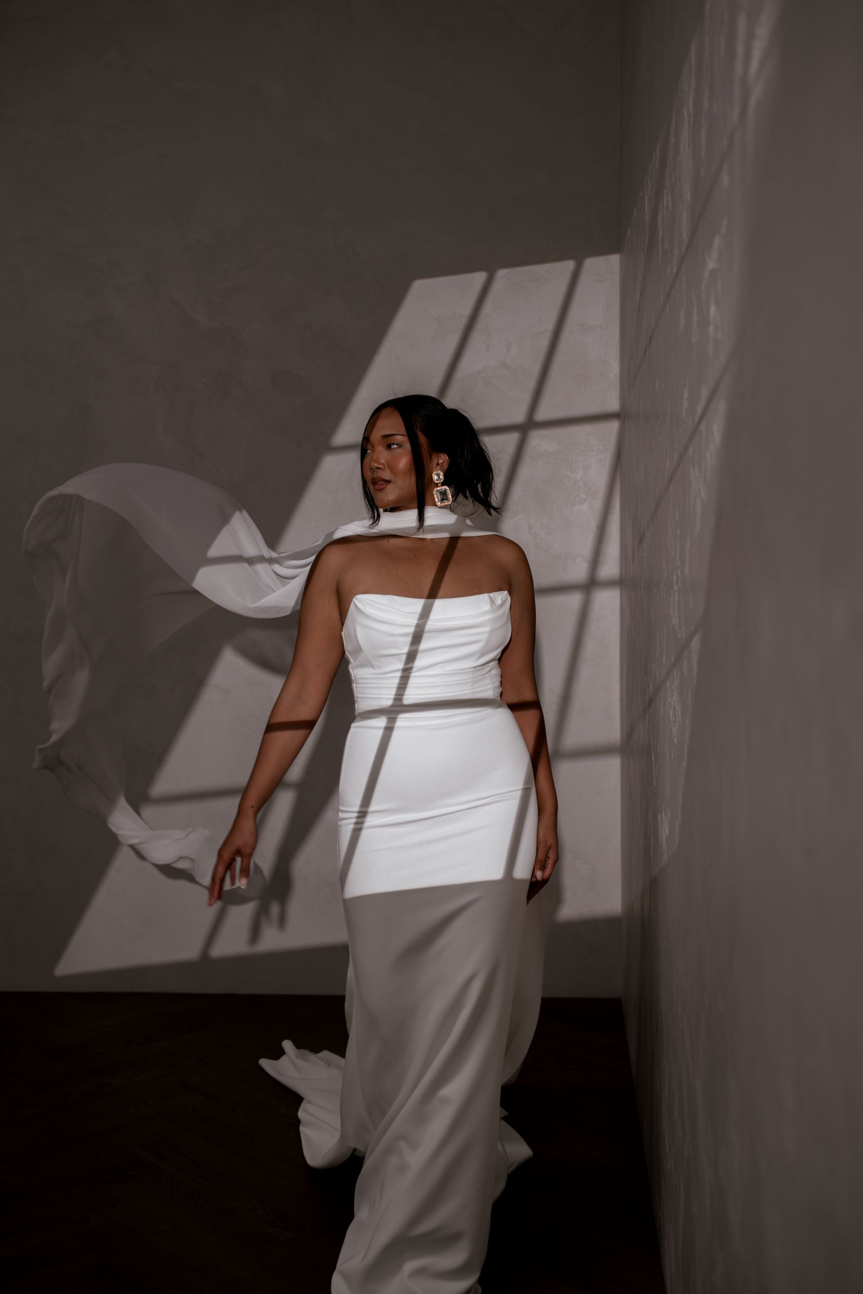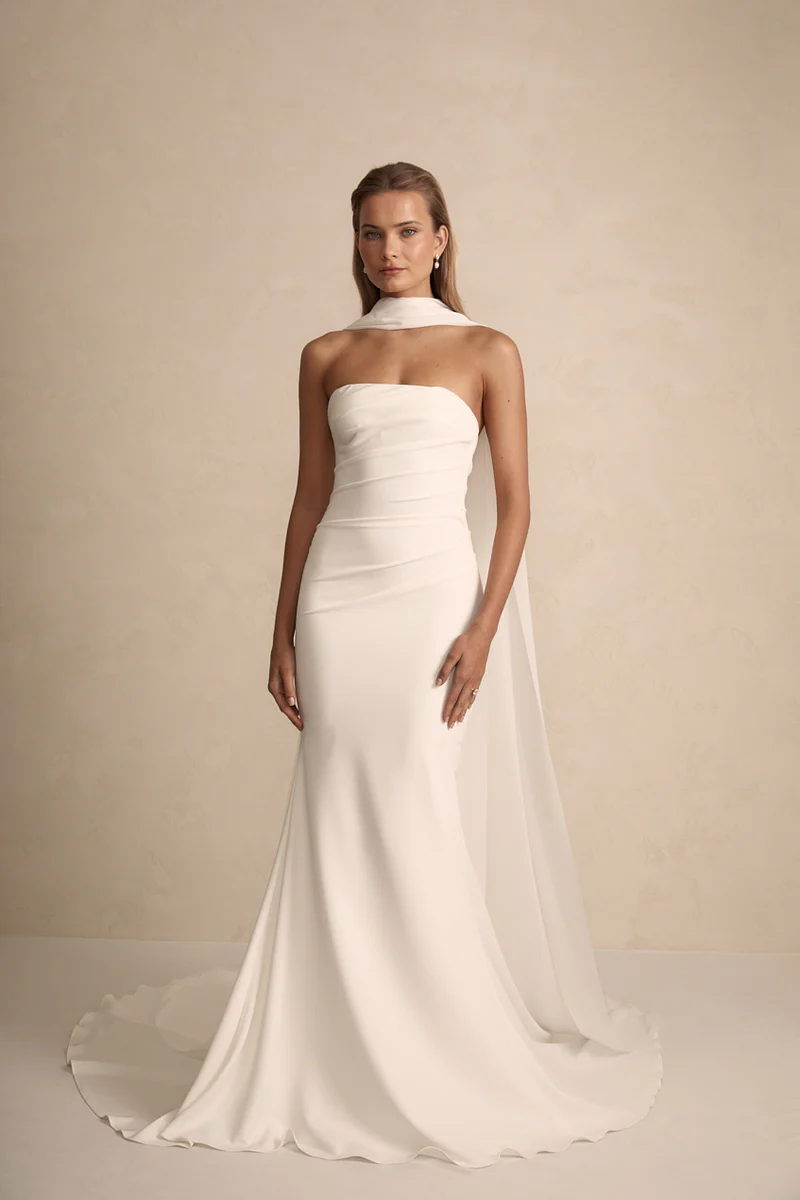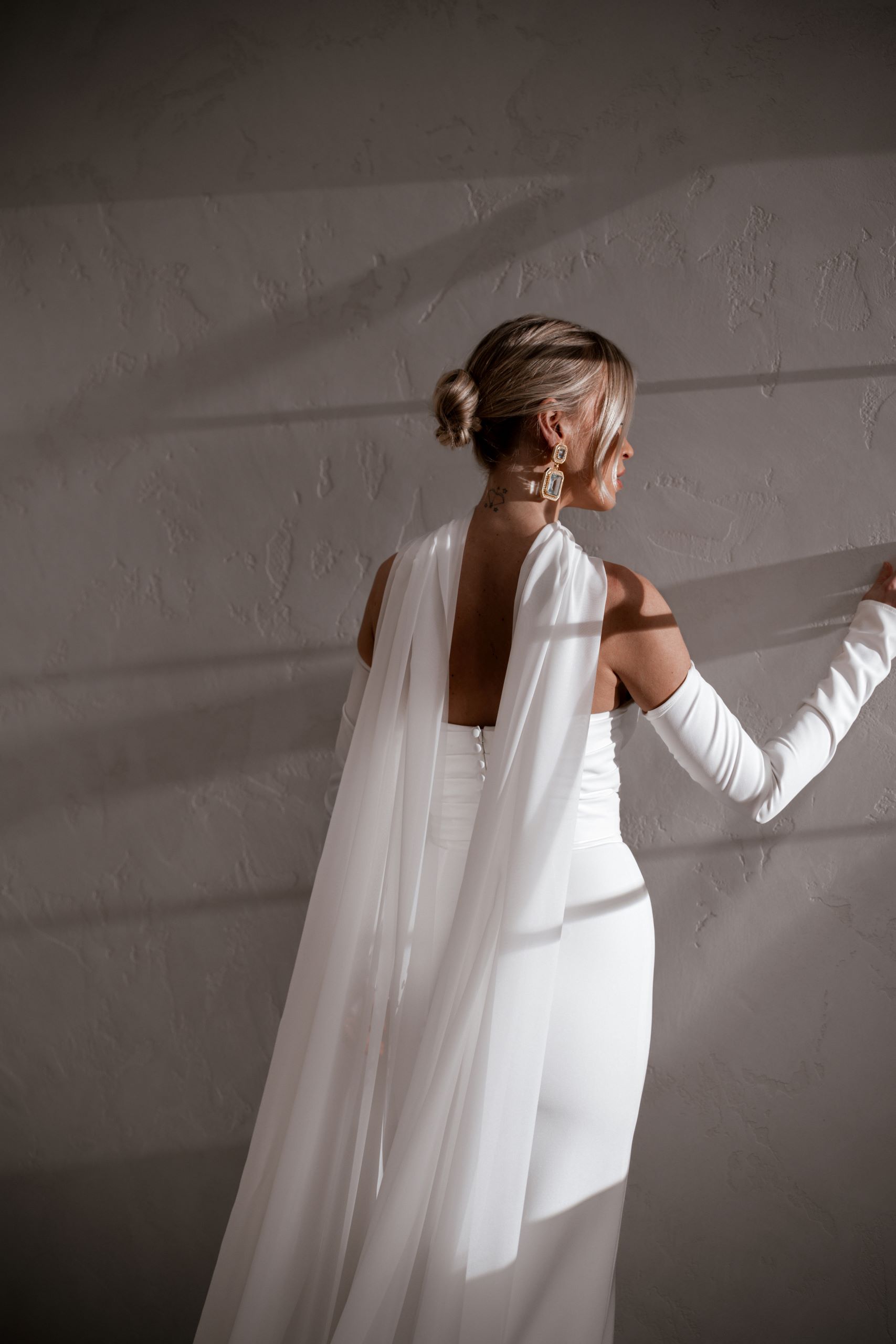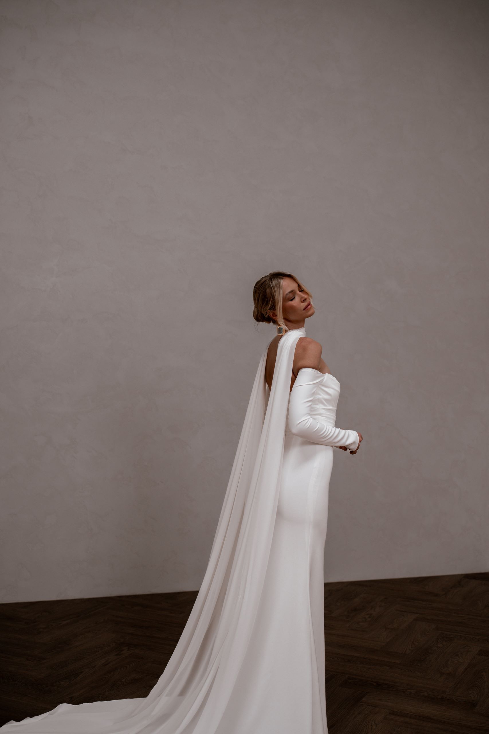 Elevate your wedding day look with our elegant Chiffon Scarf. Crafted from our softest ivory chiffon, it complements all MWL designs and offers versatile styling for two stunning looks, tailored to your unique vision.