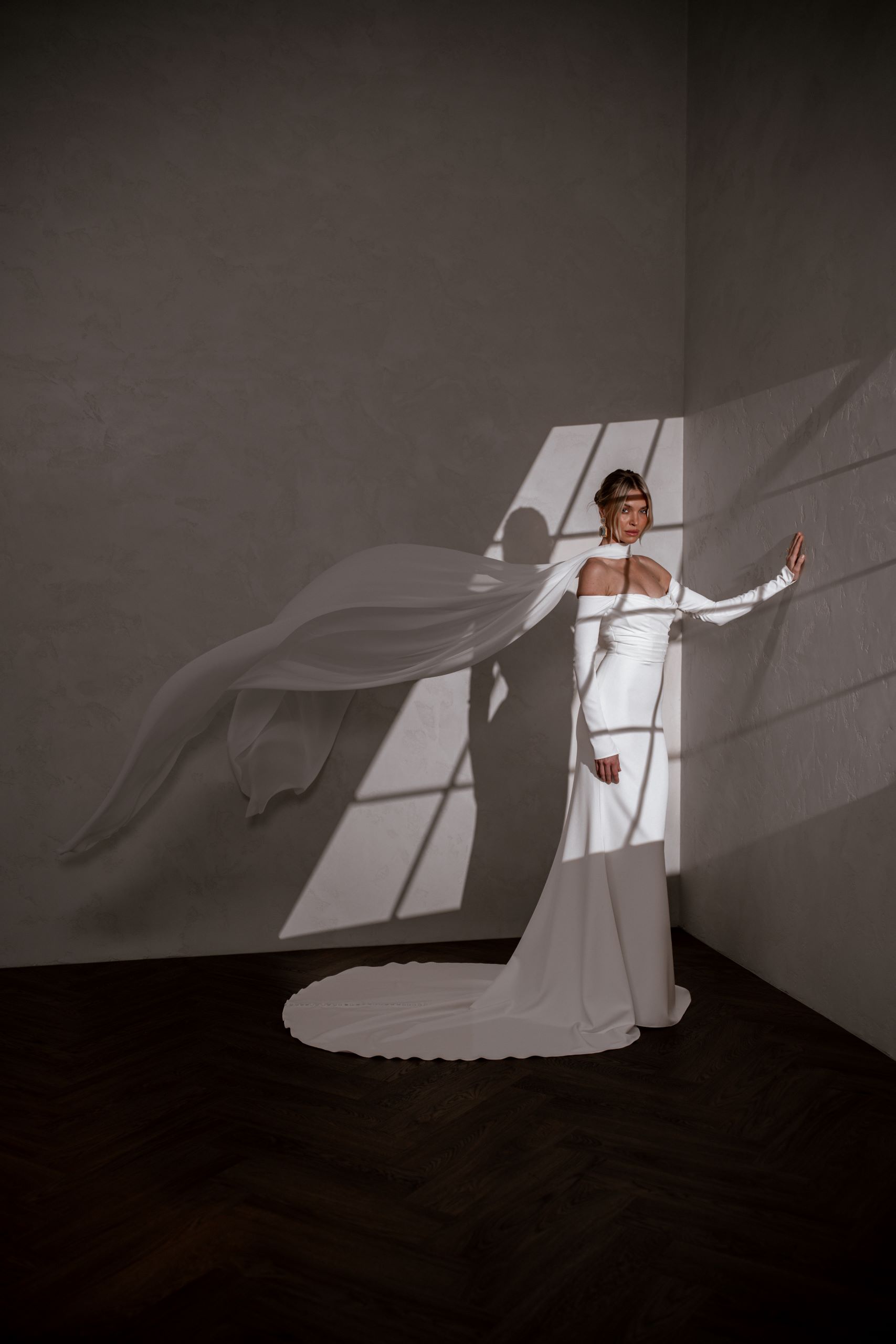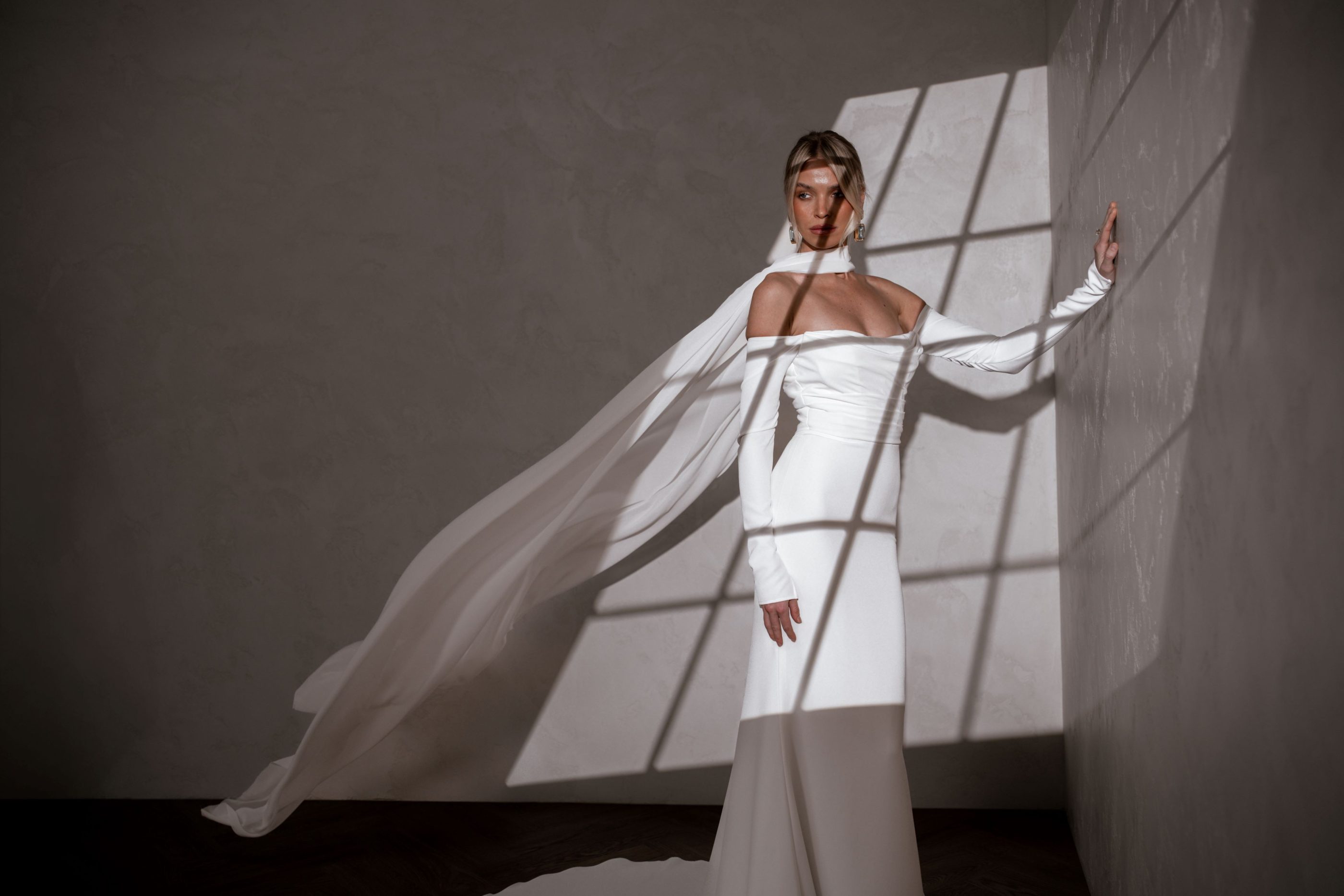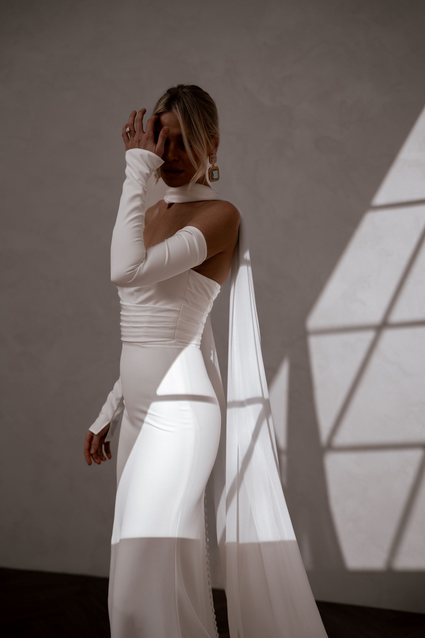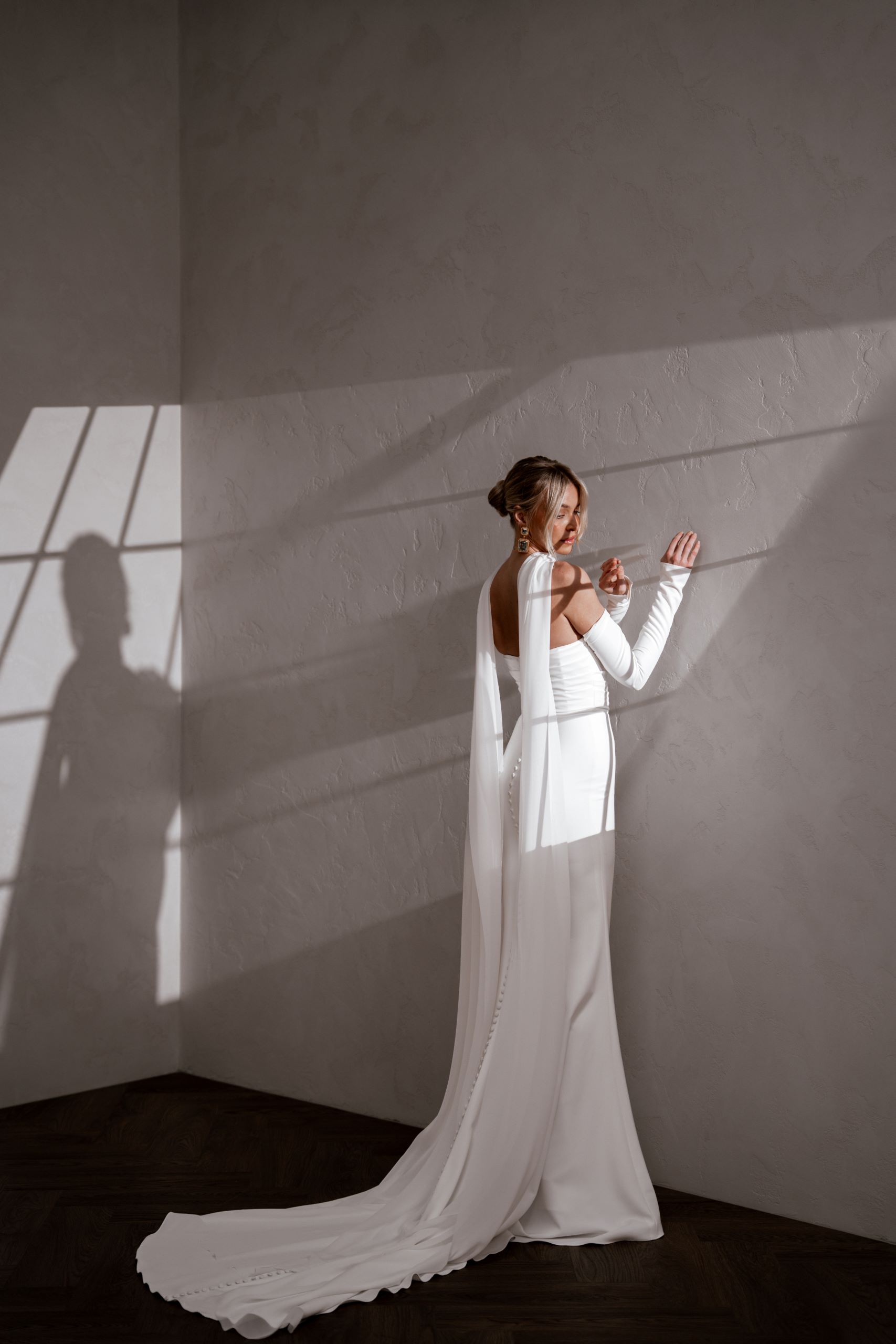 Elevate your wedding day look with our elegant Chiffon Scarf. Crafted from our softest ivory chiffon, it complements all MWL designs and offers versatile styling for two stunning looks, tailored to your unique vision.