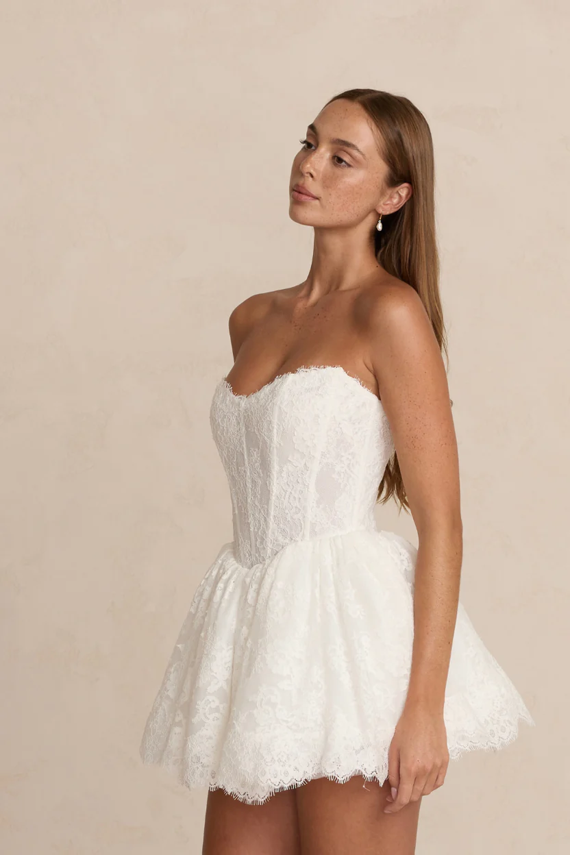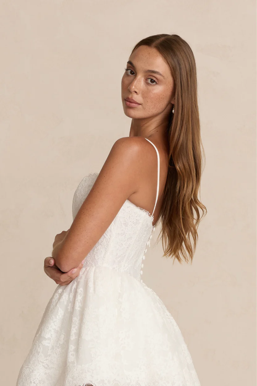 Inspired by our beloved Prim Dress, the Primrose Mini is a modern heirloom designed to flatter and enchant. Featuring a structured bodice with internal boning, it offers beautiful shape and support while maintaining an effortlessly feminine silhouette. Crafted from a romantic blend of delicate Frances lace and timeless Chantilly lace, this mini dress balances softness with structure for an elevated finish.