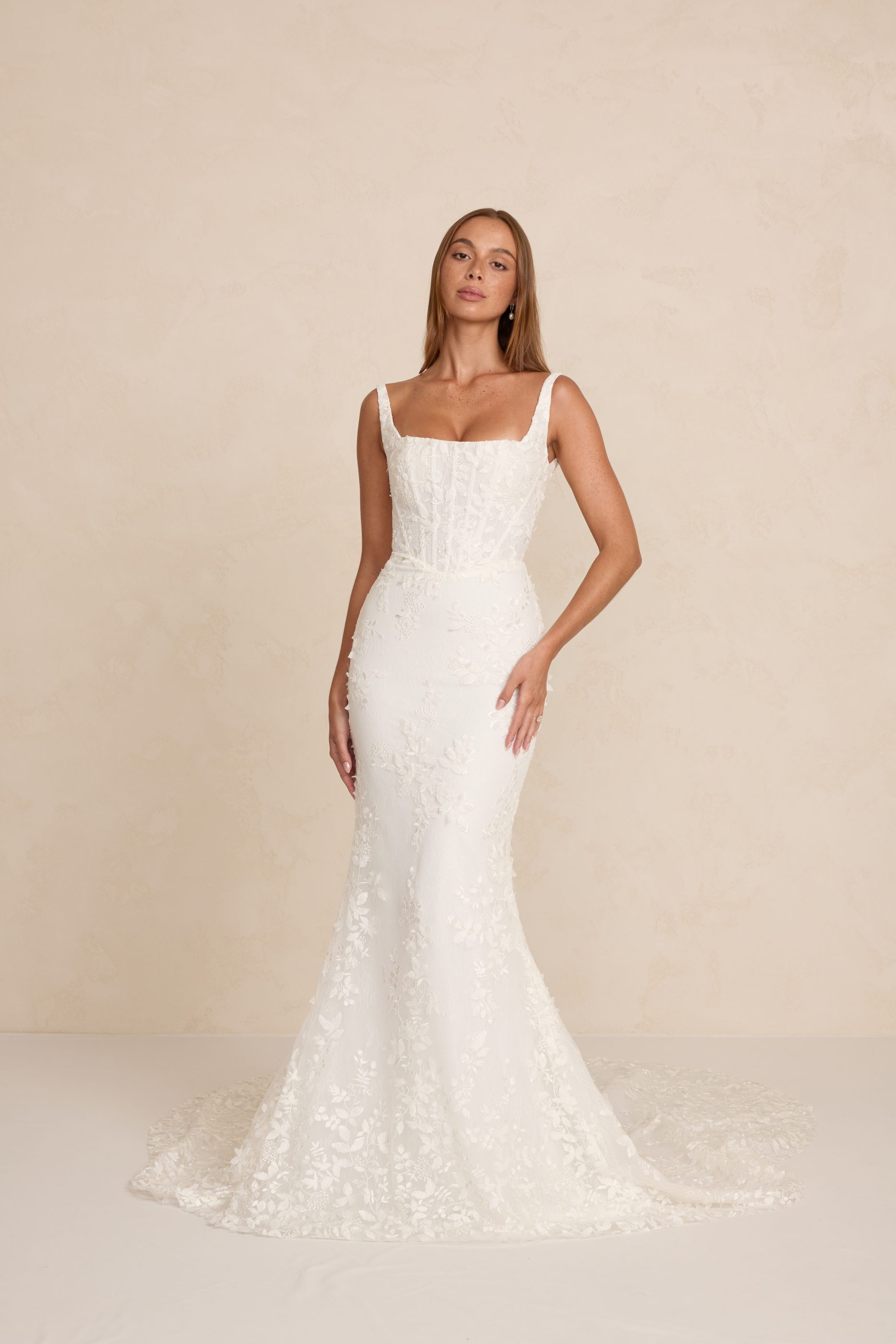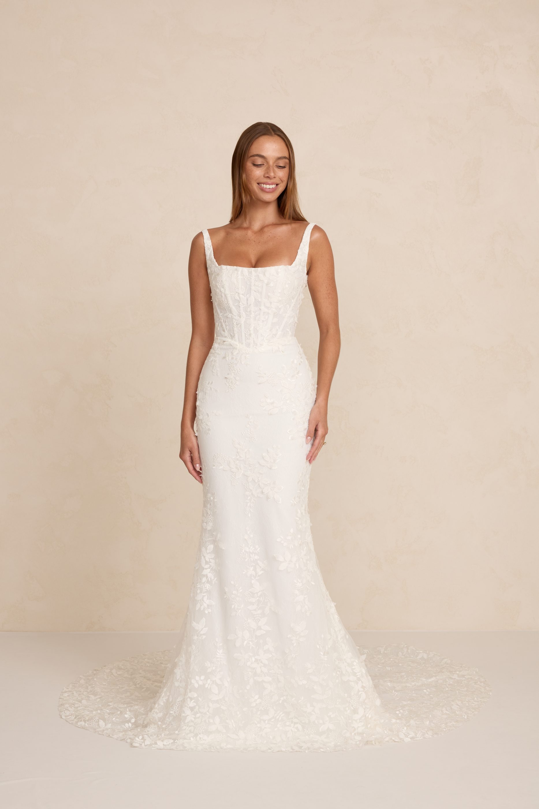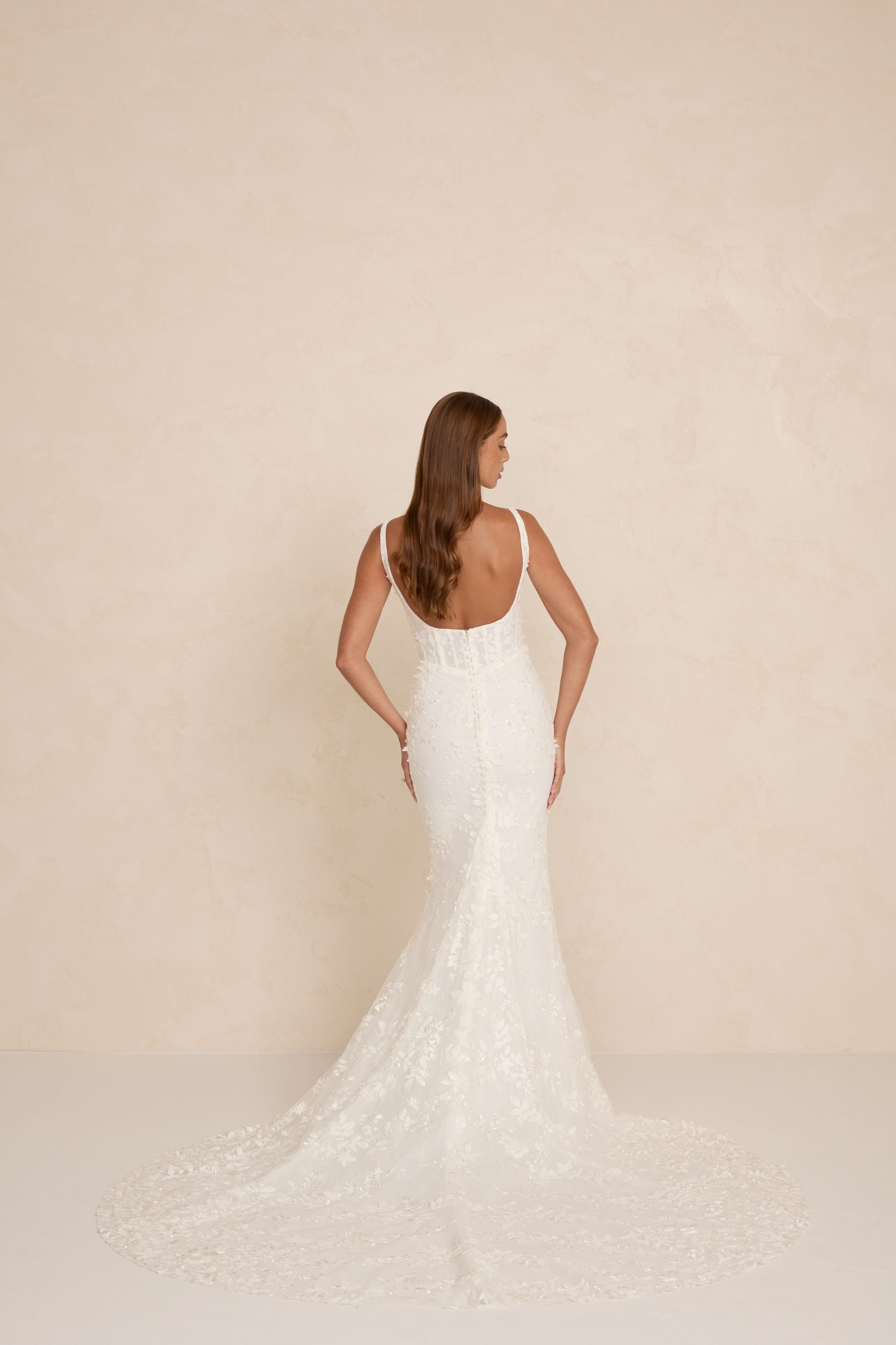 Weston features a modern square neckline, and a high square back finished with flattering buttons. Crafted in dimensional 3D lace, Weston combines romantic texture with a structured silhouette.