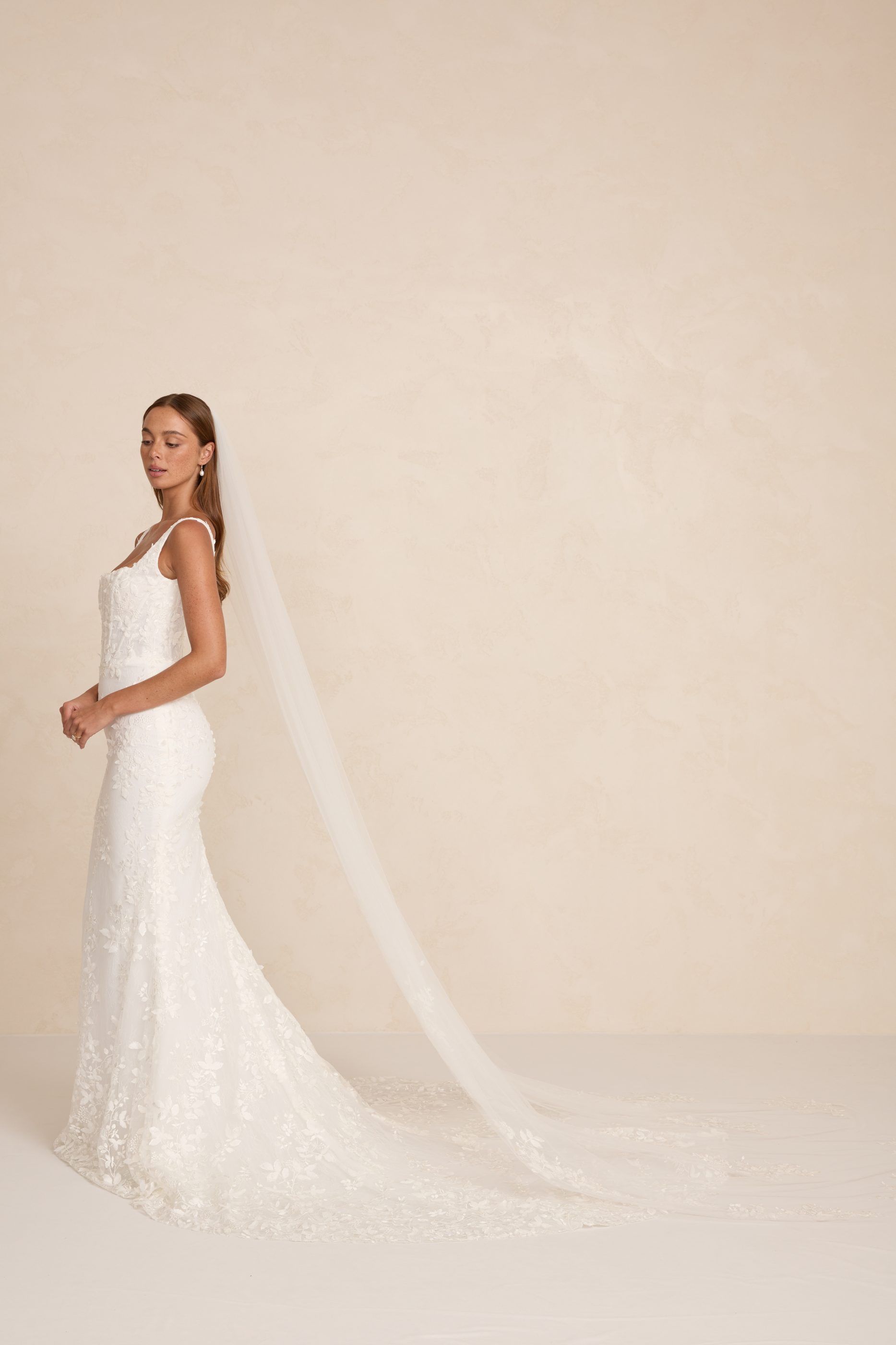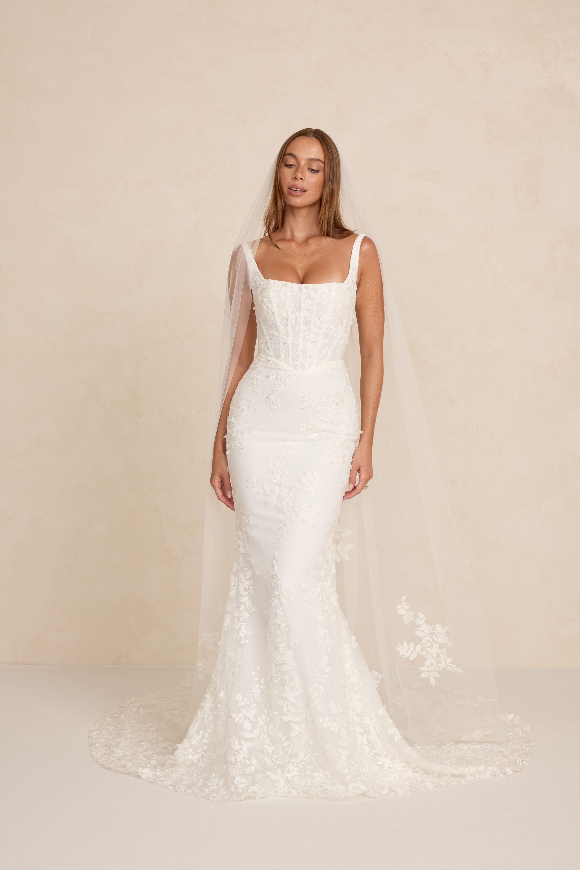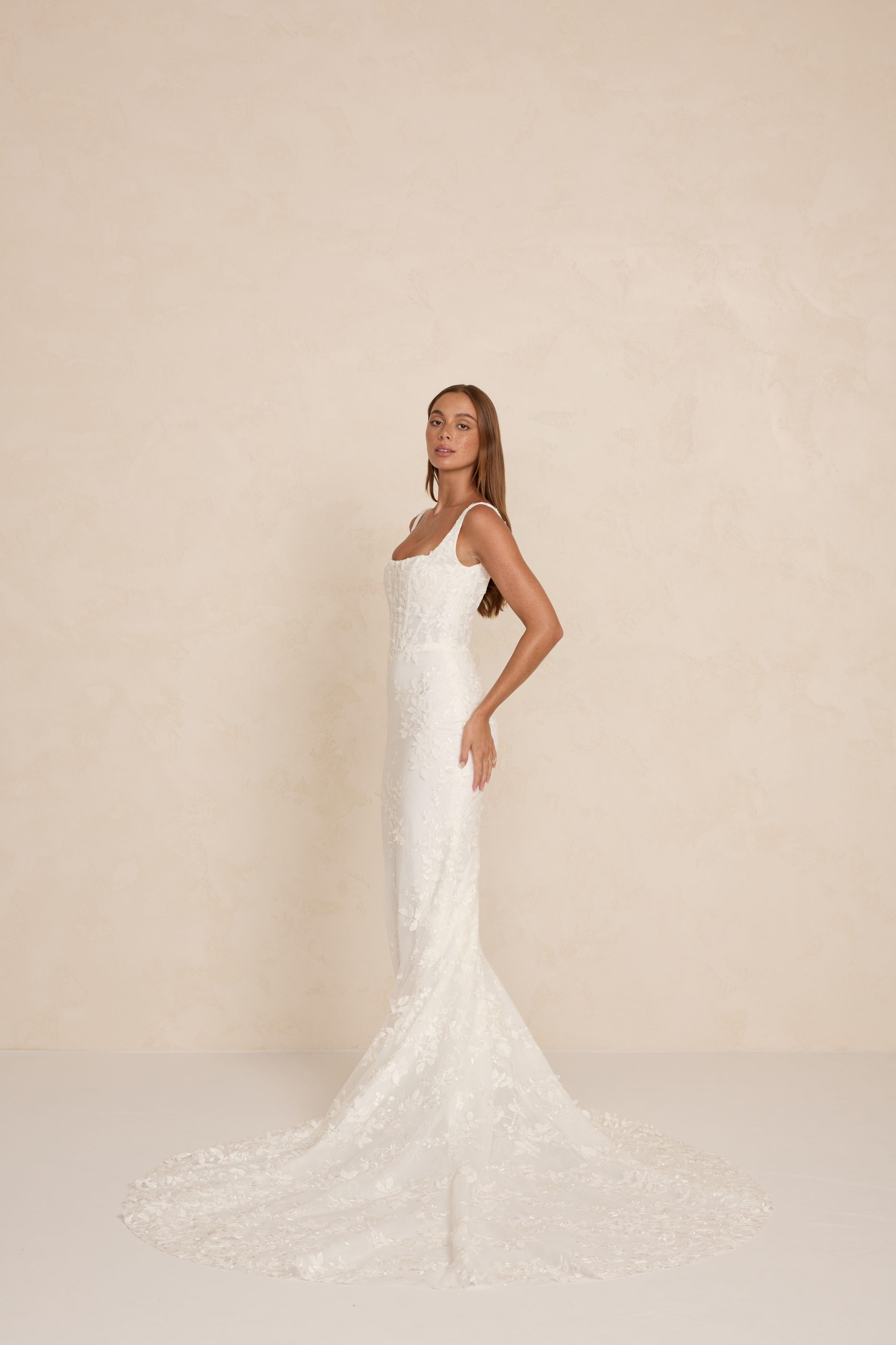 Weston features a modern square neckline, and a high square back finished with flattering buttons. Crafted in dimensional 3D lace, Weston combines romantic texture with a structured silhouette.